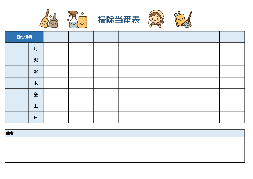 掃除当番表は、誰がいつ、どこを掃除するかを明確に表示するためのスケジュール表です。