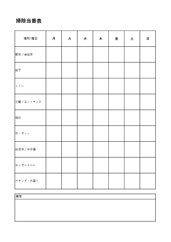 - 職場の掃除当番表として部署やフロアごとに役割分担を明確化