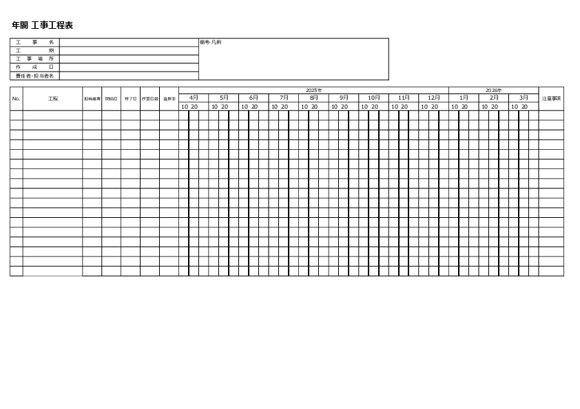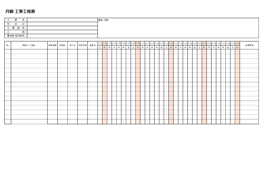 工期や管理粒度に応じてテンプレートを選べます。祝日自動反映/休日ハッチ、天候欄、凡例を備え、印刷配布にも対応。