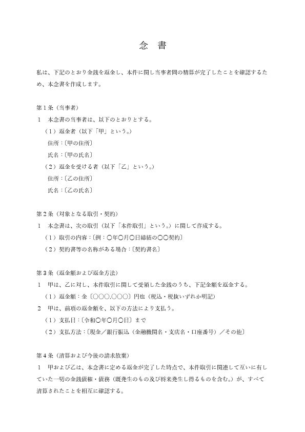 返金念書|返金・清算・今後一切請求しない旨の合意