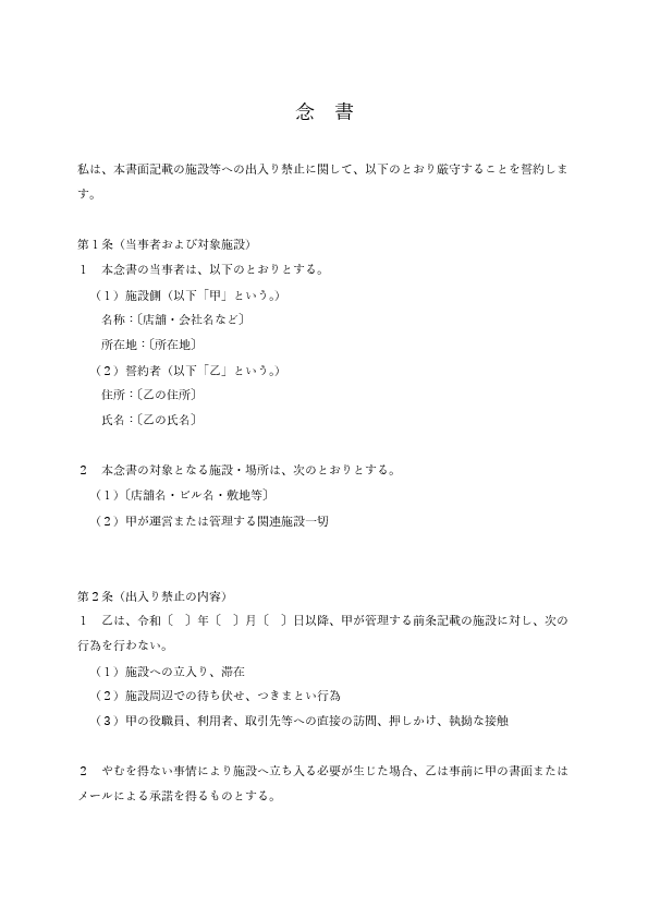 出入り禁止・立入禁止の念書|店舗・施設への接近禁止の約束