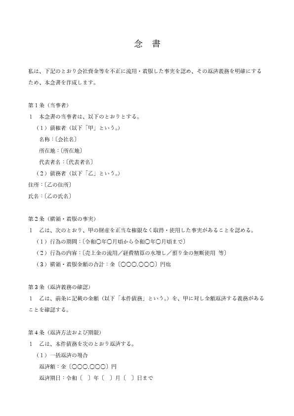 社内外での横領・着服によって生じた金銭をどのように返済するかを定める念書です。返済額・分割回数・支払期日に加え、刑事告訴や示談の扱いにも触れられる構成(最終判断は専門家への相談が前提です)