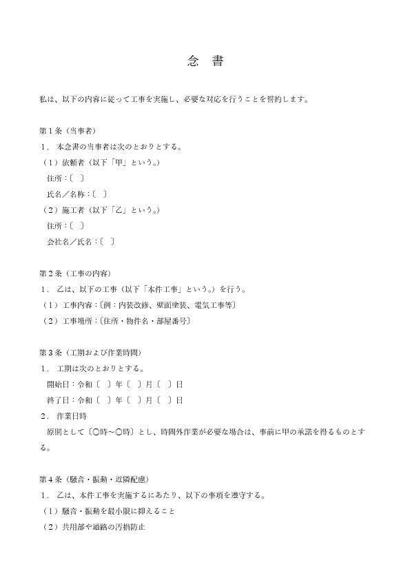 工事に関する念書(原状回復・近隣配慮・工期遵守)