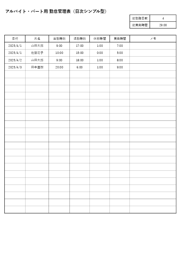 曜日固定のシフトや、ほぼ同じ時間帯で働くアルバイトが中心であれば、出退勤と実働時間を記録するだけの日次シンプル型で運用可能です。