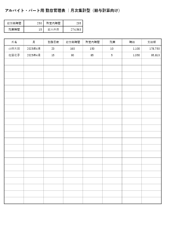 月次集計型アルバイト勤怠管理表(給与計算向け)
