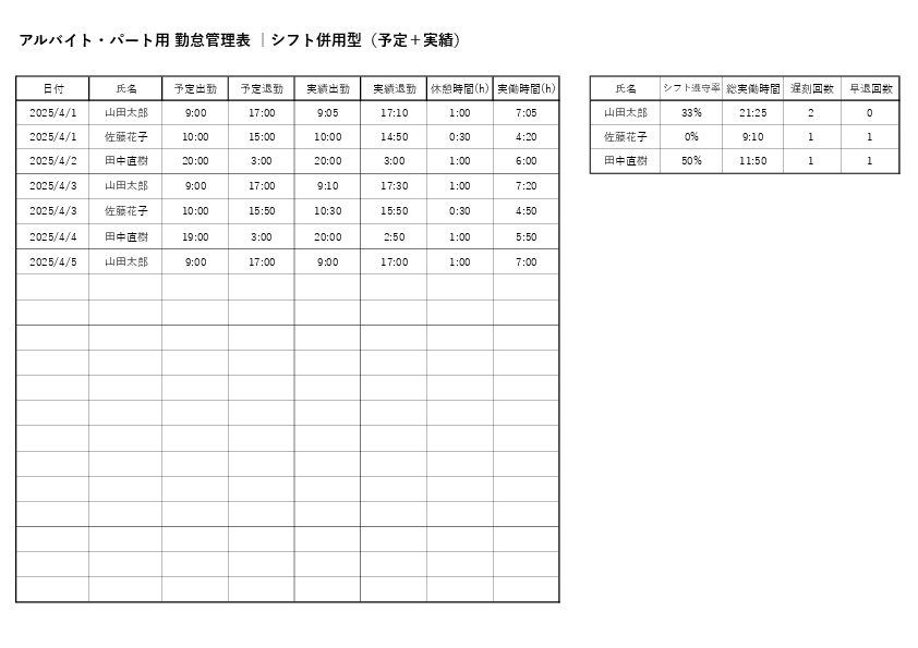 シフト併用型アルバイト勤怠管理表(予定シフト+実績)