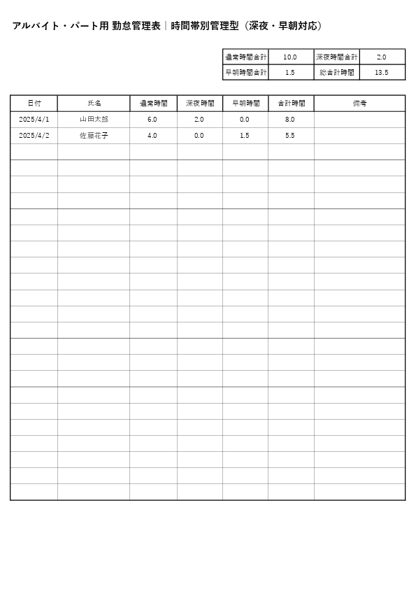 時間帯別管理型アルバイト勤怠管理表(深夜・早朝対応)