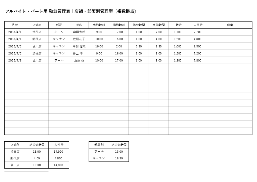 店舗・部署別アルバイト勤怠管理表(労働時間・人件費集計)