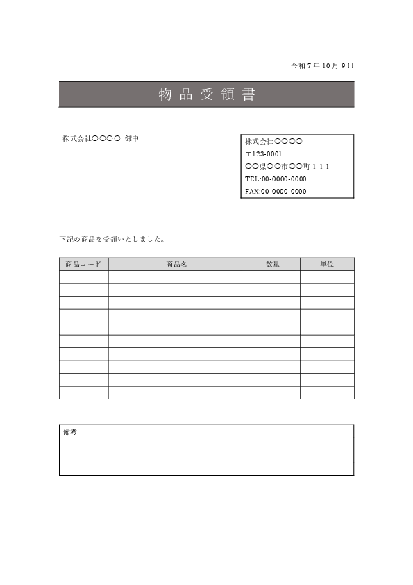 品名と数量のみを記載するシンプルな物品受領書。社内備品や貸与品の受け渡しなど、簡易な受領確認に適しています。