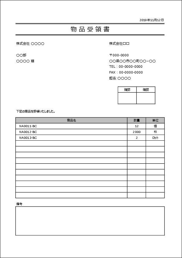 品名・数量を記載できる2分割形式。受領内容を一覧化しながら、手軽に印刷・保存したい場面に向いています。