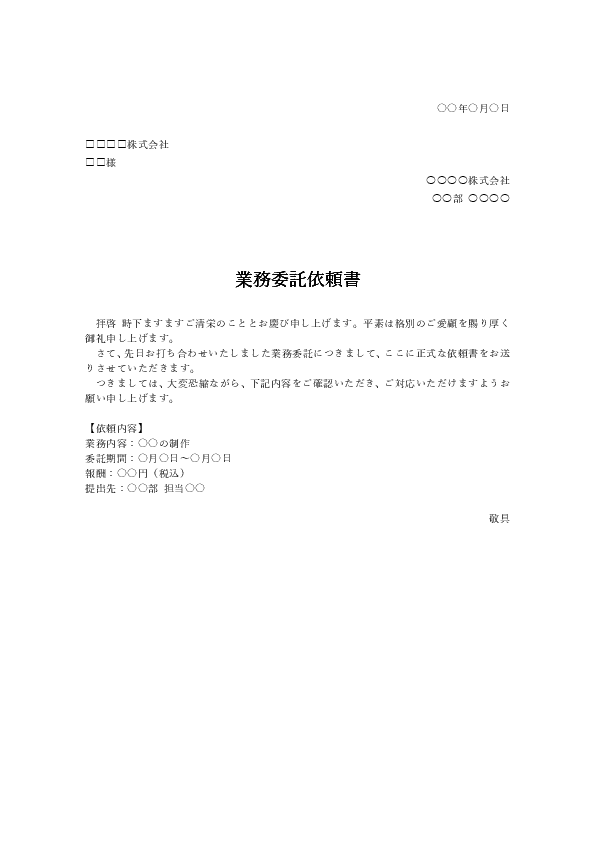 | 業務委託・社内依頼書 | 依頼範囲・成果物・期日・責任区分を明確化。部署間連携に最適。 | Word版 DL PDF版 DL |