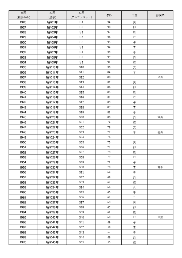 還暦・古希・喜寿などの節目年の対象者リスト作成や、社史・周年行事・長寿祝い案内で干支を併記したい場合に使えるエクセルの干支・節目年用 西暦和暦早見表です。