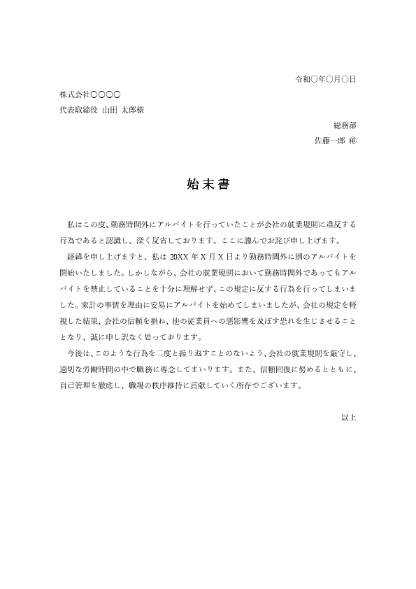 社内規定違反の始末書テンプレート(Word)