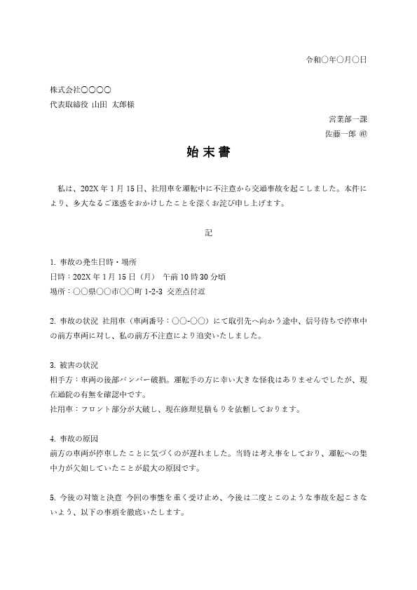 私儀、令和◯年◯月◯日◯時頃、業務中に社用車を運転していた際、駐車場内において不注意により他車両に接触する事故を起こしました。
