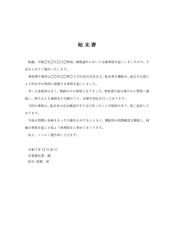 記載例|交通事故の始末書サンプル文