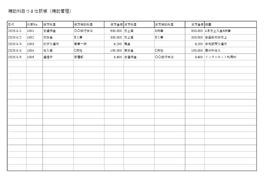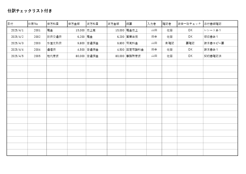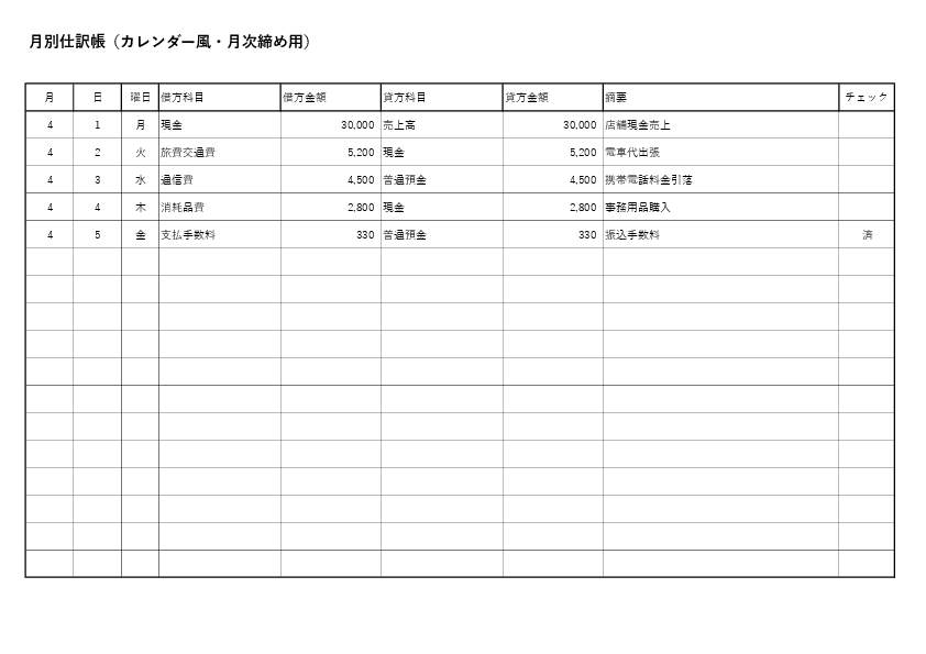 小規模な会社や個人事業主では、事務担当者や経営者自身が記帳を行うケースも多いため、テンプレートを活用して「書式を考える手間」を減らすことが大切です。