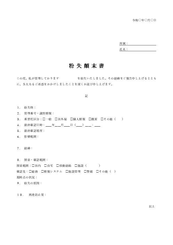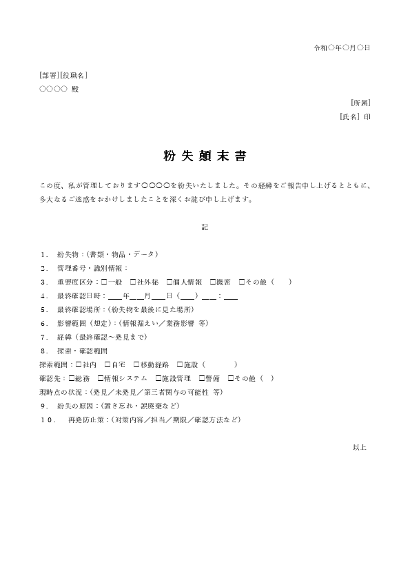 • 紛失対象を特定し、識別情報(管理番号・件名・台帳番号等)を可能な範囲で記載します