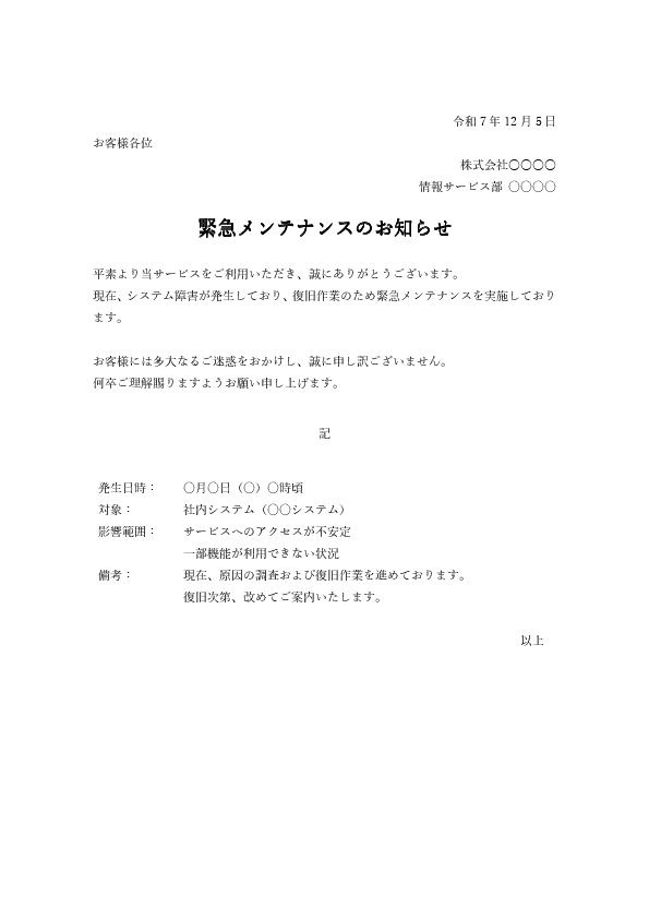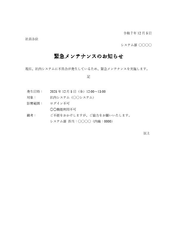 - 緊急メンテナンスの場合は、原因や経緯を簡潔に説明すること
