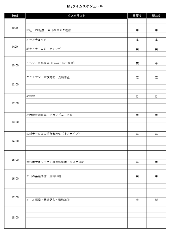 会議・集中作業・移動などを各時間枠へ配置。時間をまたぐ場合はセル結合や連続入力で表現します。
