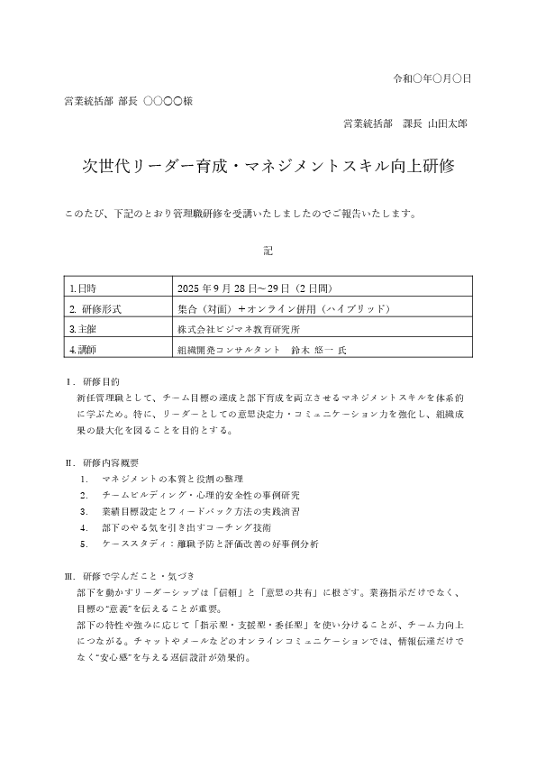 管理職研修用 研修報告書テンプレート(例文付き)
