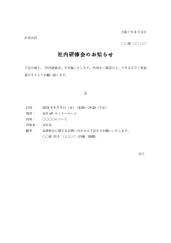 研修案内はメールで送付するケースが多くあります。件名で内容と日時が一目で分かるようにし、本文では開催要領(日時・会場・対象・プログラム・申込方法)を簡潔にまとめることが大切です。ここでは社内向け・社外向けそれぞれの文例をご紹介します。
