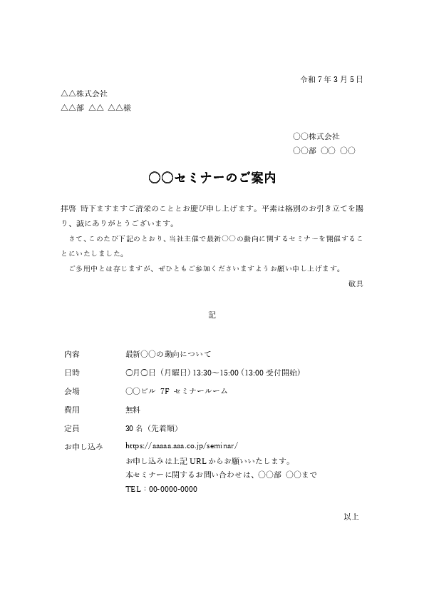 テンプレートにはダミーの会社名や会場名が入力されていますので、自社の情報に置き換えてご利用ください。