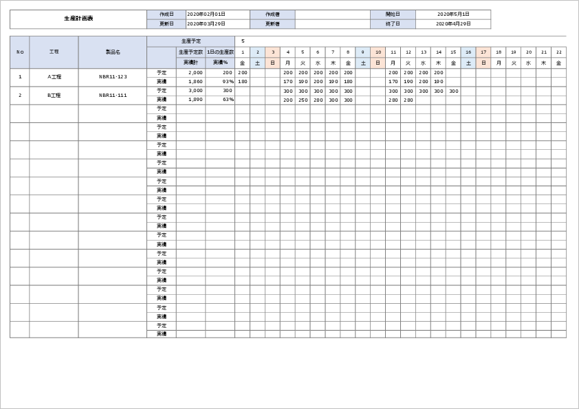 生産計画表テンプレート一覧(早見表)
