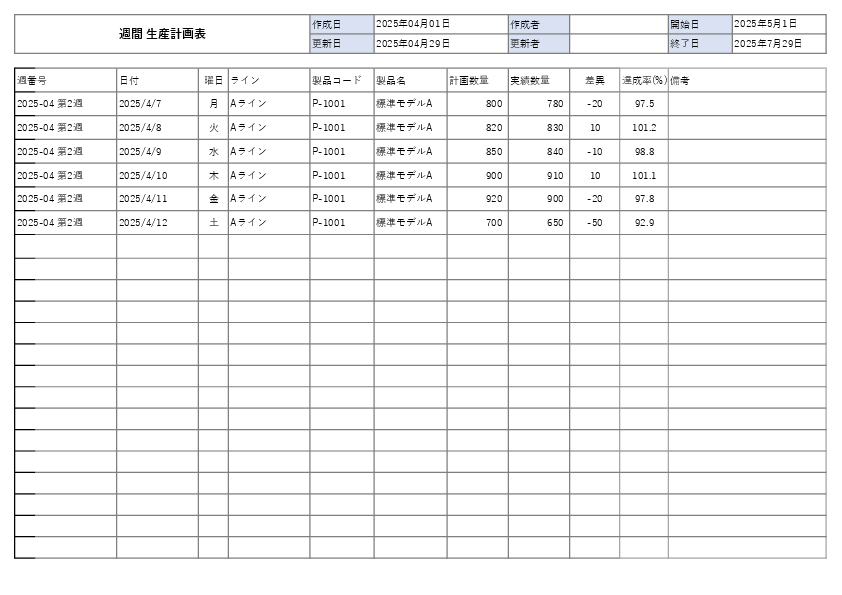 ライン別・製品別のどちらにも使える汎用形式で、週番号と日付・曜日ごとに予実を記録できます。日次の細かい管理までは不要だが、週単位で生産量をコントロールしたい工場に便利です。