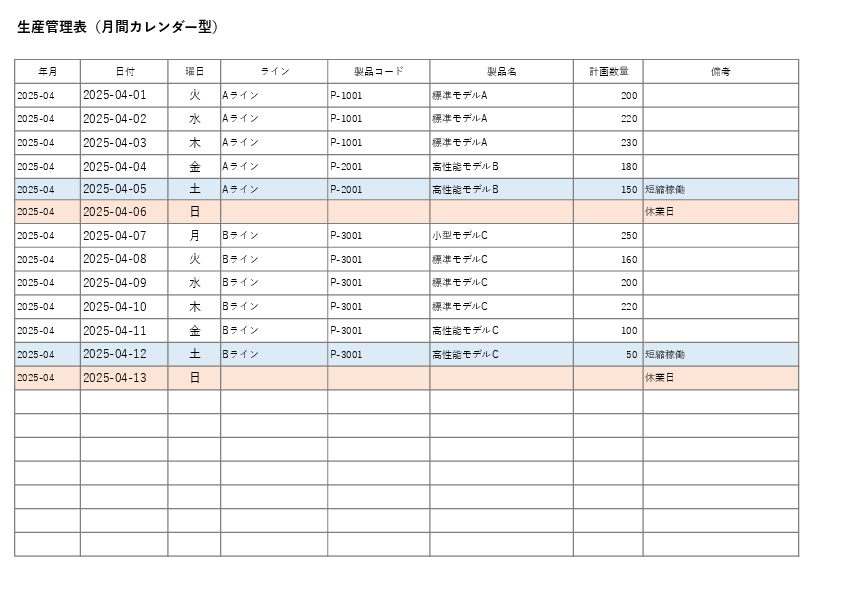 月間カレンダーのマス目に生産内容を記入するだけで、現場全体に「どの日に何を作るか」を直感的に共有できます。休日・稼働日の色分けにも対応し、掲示板や会議資料としても扱いやすい形式です。
