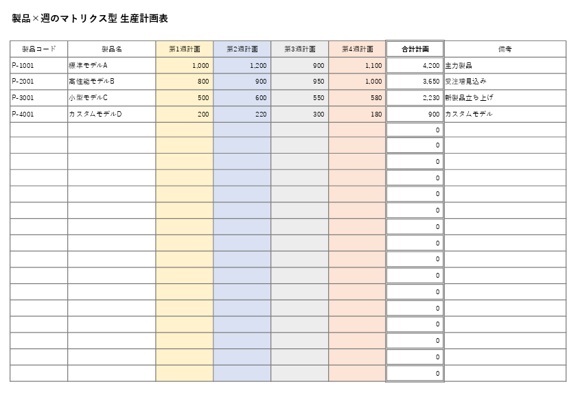 製品別に週ごとの生産計画を入力することで、月間の生産量や製品構成のバランスを一目で確認できます。主力製品・新製品・少量品の位置づけを整理したいときに便利なマトリクス形式です。
